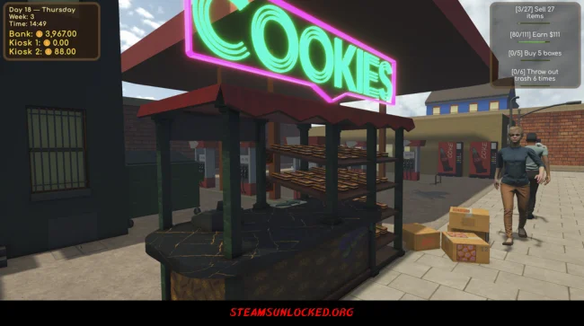 Choco Kiosk Simulator is a first person sweet shop game with a fun and crazy twist. You run a small chocolate kiosk in a city that becomes stranger every week. Your job is to attract customers survive wild zombie weekends and grow your little shop into a chocolate empire. You can even choose to break the rules and run an illegal kiosk for alien customers in the game’s “Weird Mode.”